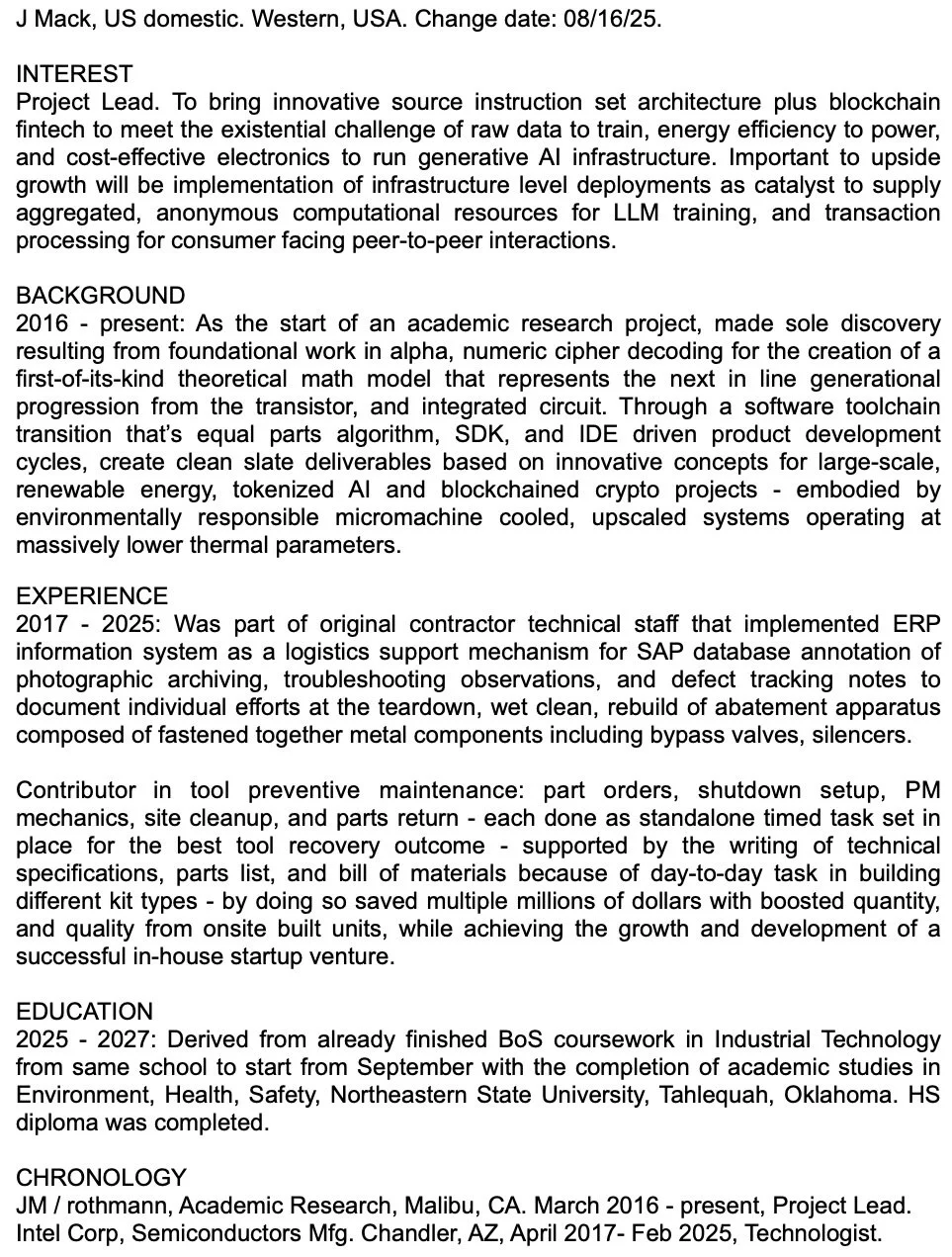 J Mack is a technologist working from Malibu, CA. He’s doing Theoretical Mathematics (research).